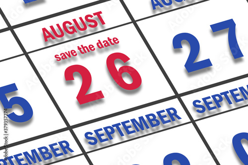 august 26th. Day 26 of month, Date marked Save the Date on a calendar. summer month, day of the year concept