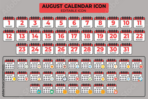 August Calendar Icons Collection: Editable and Customizable for Event and Schedule Management