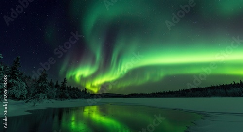 Aurora Borealis Over Frozen Lake with Snow-covered Trees at Night