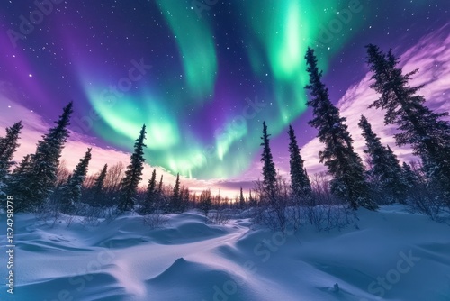 Aurora Borealis over snowy forest at night, winter landscape