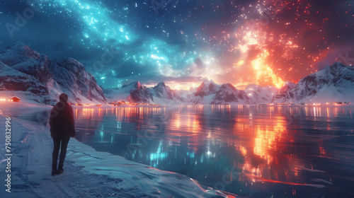 Aurora borealis over the sea, snowy mountains and city lights at night. Northern lights in Lofoten islands, Norway. Starry sky with polar lights. Winter landscape with aurora, reflection, sandy beach.