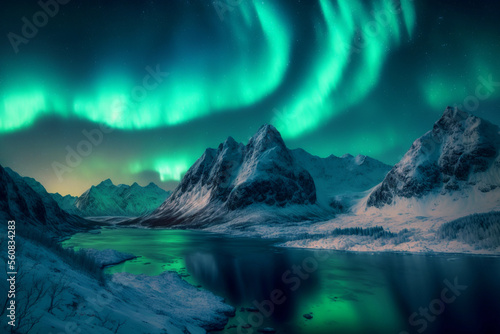 Aurora borealis over the snowy mountains, sea coast at night. Generative AI. Aurora borealis above the snow covered rocks. Winter landscape with polar lights and fjord. Starry sky with bright aurora