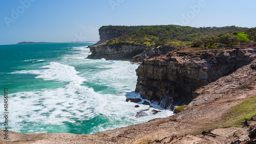 Australian coast, high cliffs on the seashore, seaside landscape with blue water, view from the cliff on a sunny summer day.