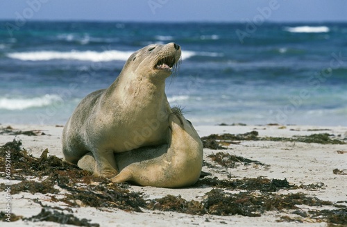 AUSTRALIAN SEA LION neophoca cinerea, ADULT PAIR MATING ON BEACH, AUSTRALIA