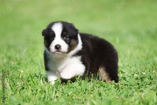 Australian Shepherd Aussie puppy of black and white tricolor color in the spring garden against a background of green grass