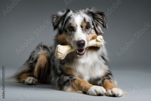 Australian Shepherd Dog Relaxing with Bone Toy, Fluffy Coat, Happy Expression on Gray Background - Peaceful Pet Moment.