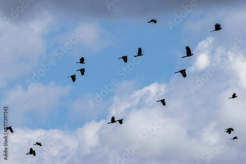 Australian Yellow-tailed Black Cockatoo flock in flight