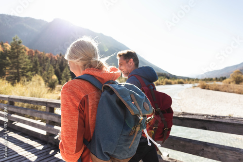 Austria, Alps, couple on a hiking trip crossing a bridge