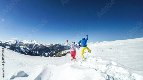 Austria is famous for its ski slopes. During winter this country turns into a winter wonderland full of joy and happiness. A couple jumping into the snow out of happiness..