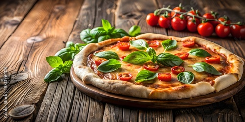 Authentic Italian pizza with fresh basil served on an old rustic wooden table in a restaurant setting