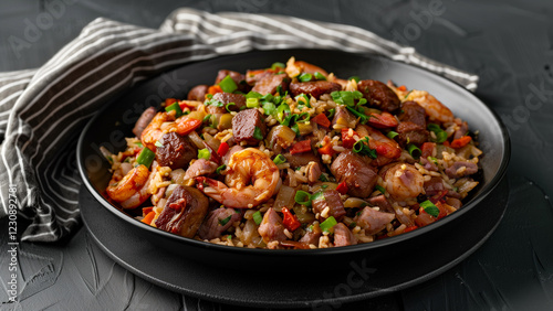Authentic Louisiana Jambalaya on a Sleek Black Plate
