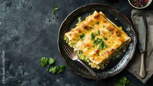 Authentic mexican flavor of green enchiladas served on a plate with silverware