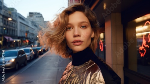 Authentic portrait of a young blonde woman with a short haircut in a city park. Fashion and beauty.