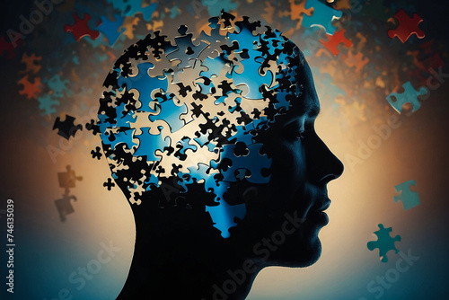 "Autism Awareness: Silhouette with Scattered Puzzle Pieces"