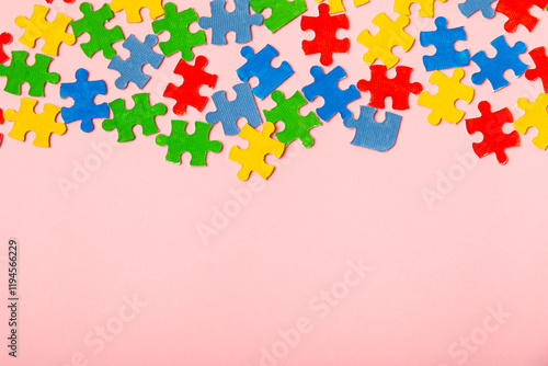 Autism puzzle.Autism awareness day. Colorful bright puzzles.Puzzle. 2 April world autism awareness day background. Top view. Space for text.Copy space.Design element.Care Awareness campaign for Autism