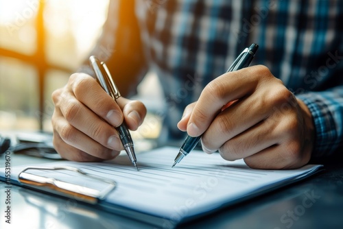 Auto check up and car service shop concept. Mechanic writing job checklist to clipboard to estimate repair quotation to client at workshop garage, Generative AI