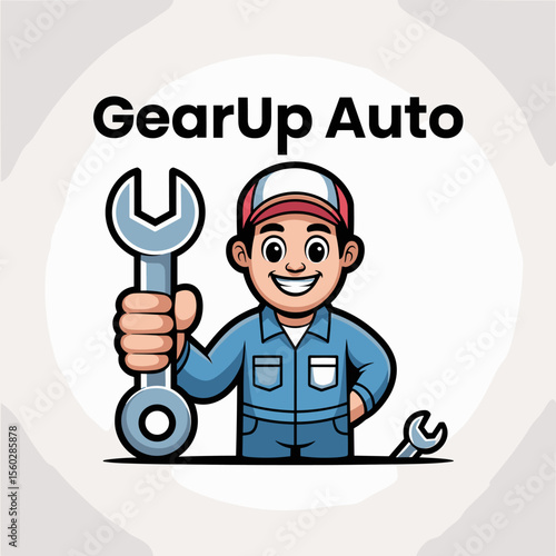 Auto mechanic cartoon character holding wrench, automotive service, maintenance, smiling