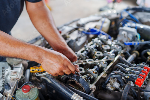 Auto mechanic repair engine in a car repair shop and Checking a car engine for repair at car garage.Car engine repair. Car service