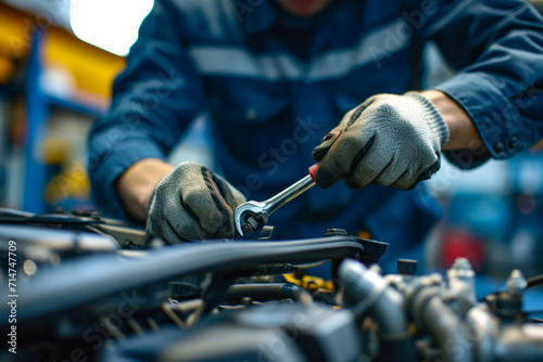 Auto mechanic working in auto repair service. Mechanic repairing a car engine.