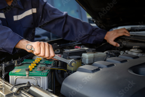 Auto mechanic working on car engine in mechanics garage. Repair service.