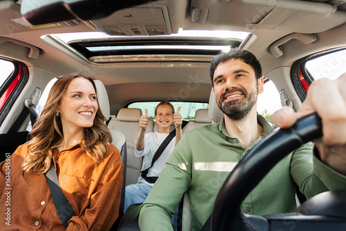 Auto purchase concept. Happy family driving new automobile, enjoying road trip, child girl showing thumbs up sitting on back seat, family spending traveling by car