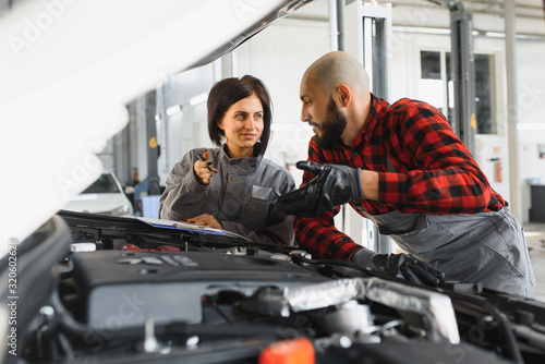 auto service, repair, maintenance and people concept - mechanic men with wrench repairing car engine at workshop