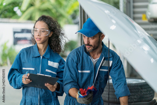 Auto services and Small business concepts. Auto mechanic man and woman with automotive diagnostic scanner and clipboard checking car at workshop.