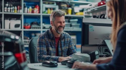 Auto shop salesman seated at a desk with a computer, engaging with a customer and smiling