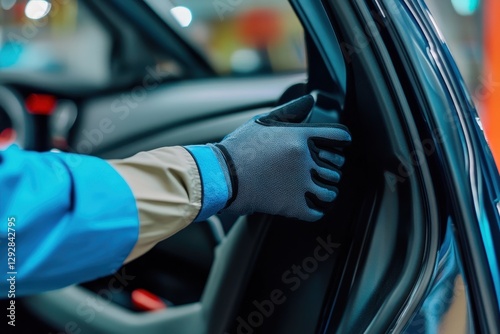 Auto technician adds soundproof foam to car door trim enhancing sound quality or noise reduction Car sound insulation installation process