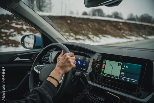 Auto travel concept, woman driving car in winter wilderness with map navigator