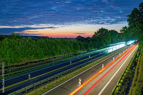Autobahn at dusk with lane closures, yellow markings, headlights