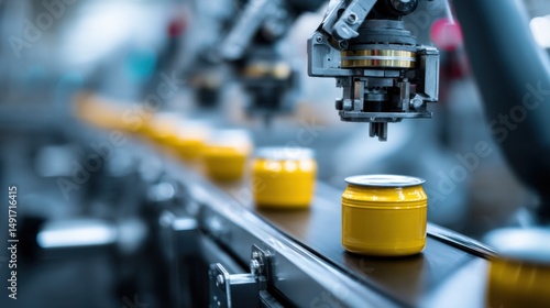 Automated canning process with robotic arm on assembly line in a factory close up industrial manufacturing