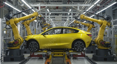 Automated Car Manufacturing Process - Yellow car on assembly line with robotic arms, showcasing modern automotive production technology