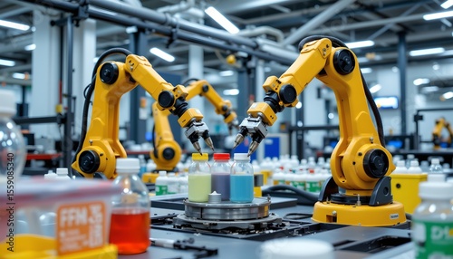 Automated chemical processing industrial laboratory robotic arms high-tech environment close-up innovation