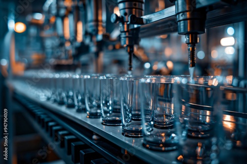 Automated industrial machinery filling empty glasses while moving on conveyor belt in factory