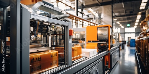 Automated packaging line with orange boxes moving along conveyor belt in a factory