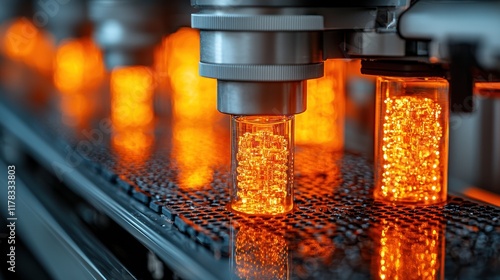 Automated Pharmaceutical Production Line: Glowing Capsules on Conveyor Belt