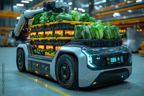"Automated Robot Transporting Various Fresh Vegetables in Colorful Crates Across a Modern Warehouse"