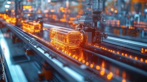 Automated robotic arm working on an assembly line with orange glowing parts.