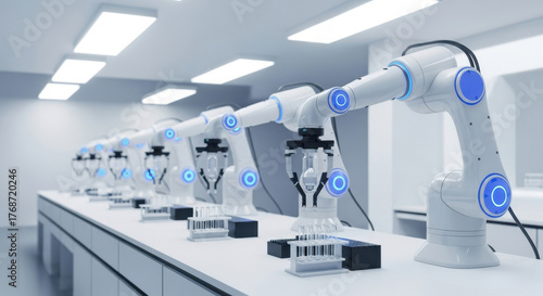 automated robotic arms handle test tubes in futuristic, sterile laboratory. medical innovation, pharmaceutical research, and advanced science technology concept.