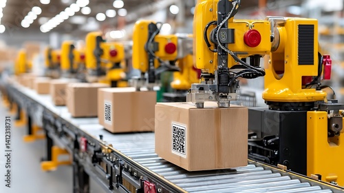 Automated Warehouse Robotics Yellow Robots Sorting Packages on Conveyor Belt