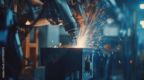 Automated welding robot performing precise tasks, showcasing advanced industrial automation.