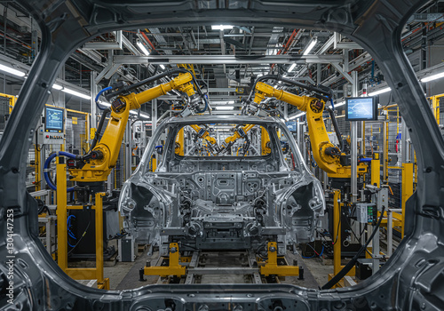 自動車の製造ライン(工場内部)・産業用ロボットアームが車のフレームを組み立て中|Automobile production line (inside the factory) - Industrial robot arm is assembling the car frame