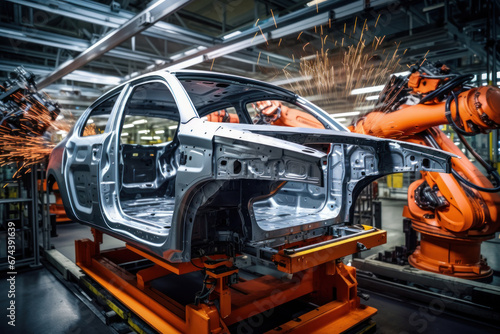 Automobile production line. Welding car body. Modern car assembly plant. Auto industry. Interior of a high-tech factory, modern production.
