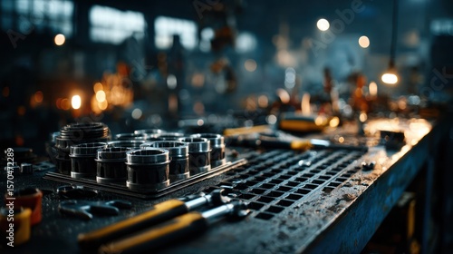 Automotive engine close-up with tools on workbench, precision and craftsmanship in focus