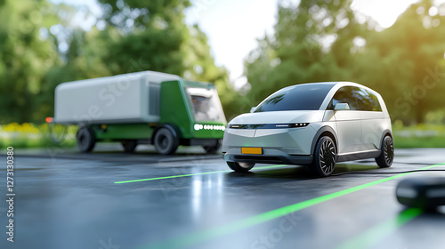 Autonomous delivery vehicles charging at renewable energy stations urban environment futuristic transportation outdoor viewpoint