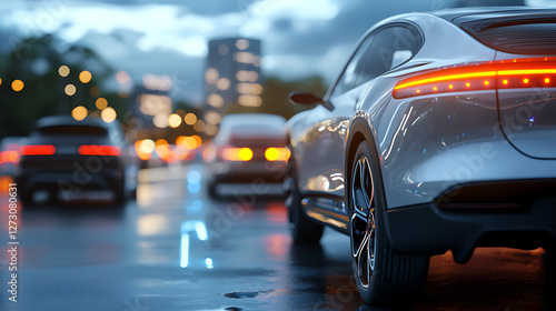Autonomous electric car charging event urban environment digital artwork blurred bokeh background futuristic concept