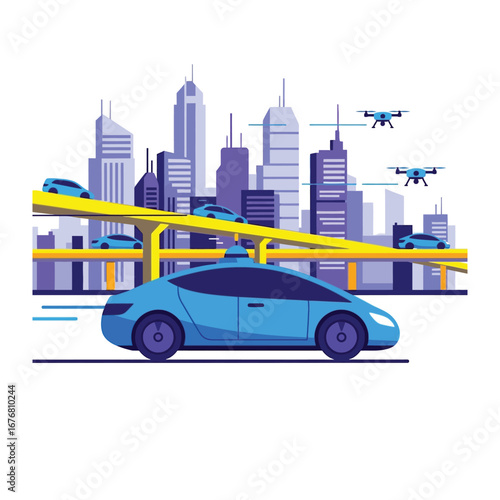 Autonomous vehicles and drones in futuristic cityscape: An illustration of a cityscape showcases the seamless integration of autonomous vehicles and drones, paving the way for smart urban mobility.