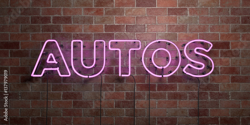 AUTOS - fluorescent Neon tube Sign on brickwork - Front view - 3D rendered royalty free stock picture. Can be used for online banner ads and direct mailers..