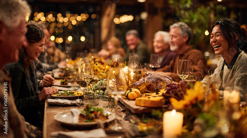 Autumn - themed Thanksgiving table with extended family sharing laughter over vegetarian stuffed squash, in a rustic home with warm golden lighting, a perfect celebration scene.